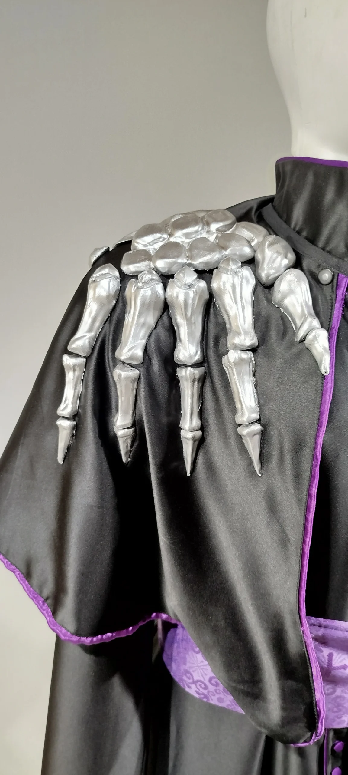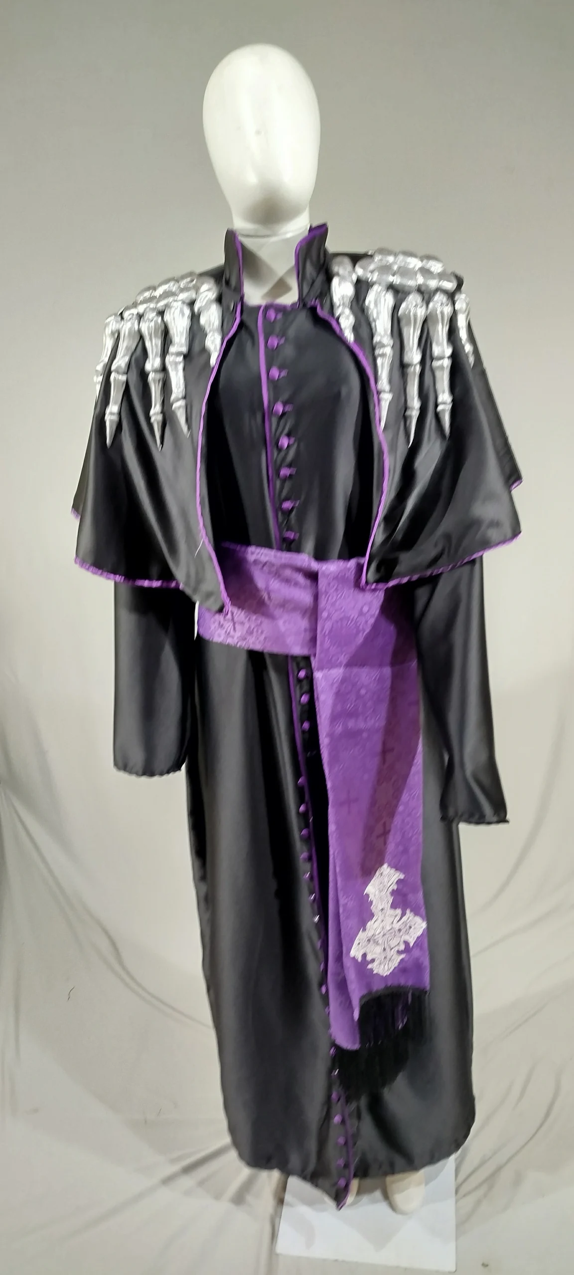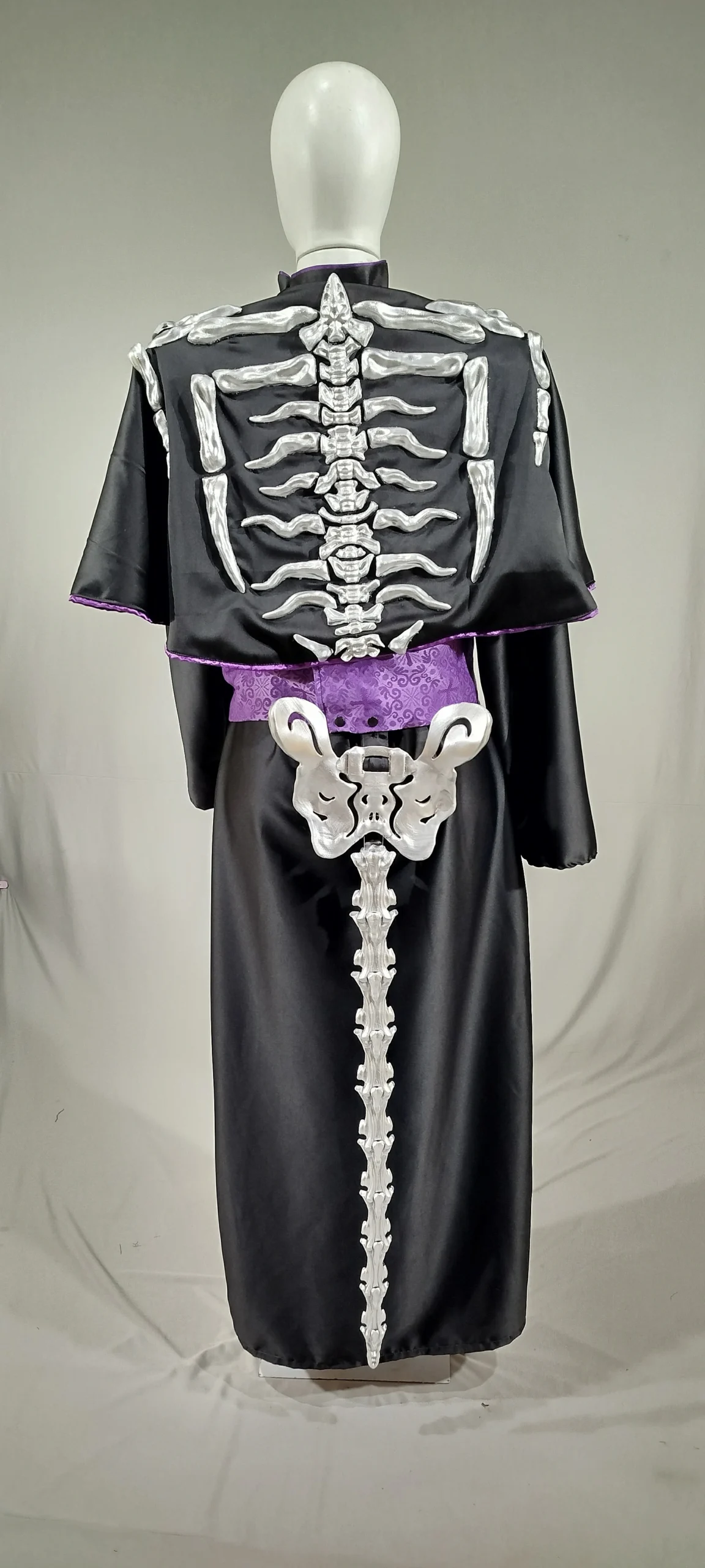 Complete set: mitre + cassock (ceremonial robe) + overcoat + embroidered waist sash — all inspired by the ceremonial robes of the Ghost universe. Striking details: 3D skeleton appliqués on the overcoat and cassock enhance the visual impact of the garment.