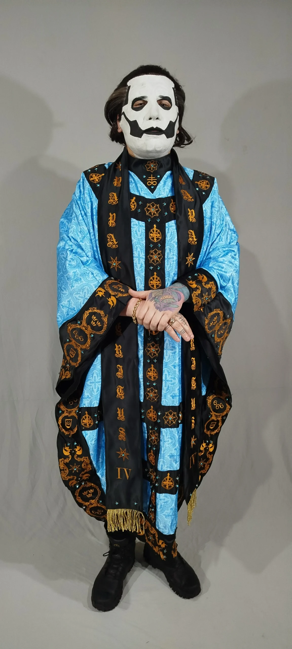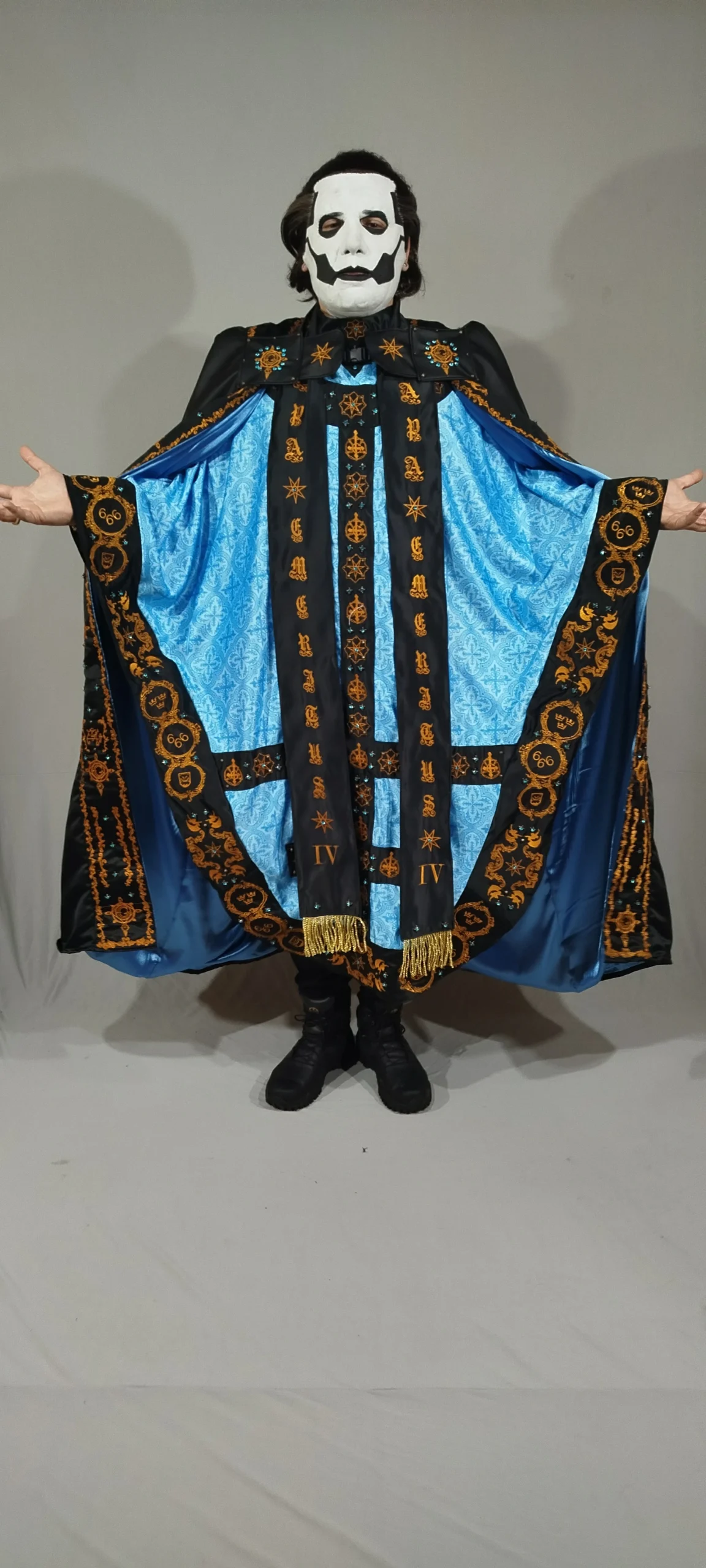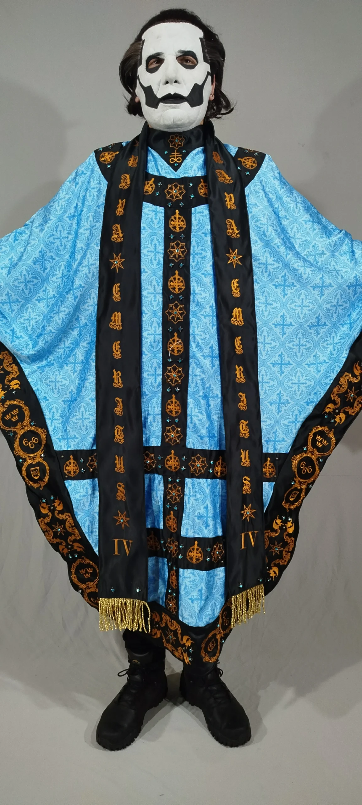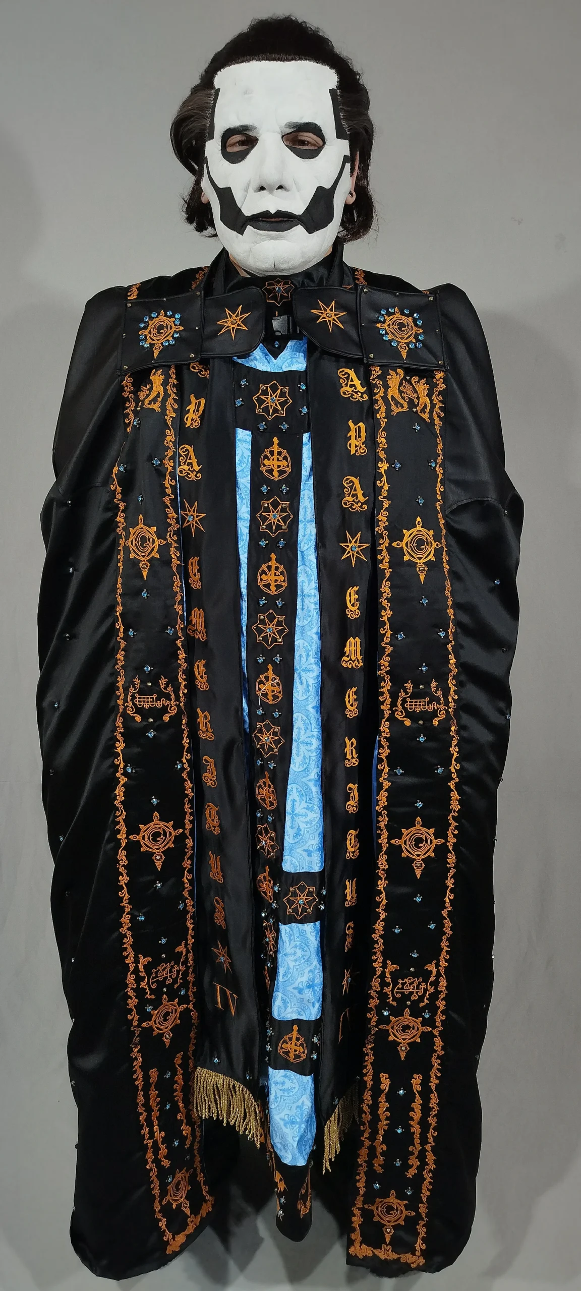 (Inspired) Majestic Black costume with chasuble, stole, cape, and miter. Featuring high-quality embroidery, rhinestones, and rivets.