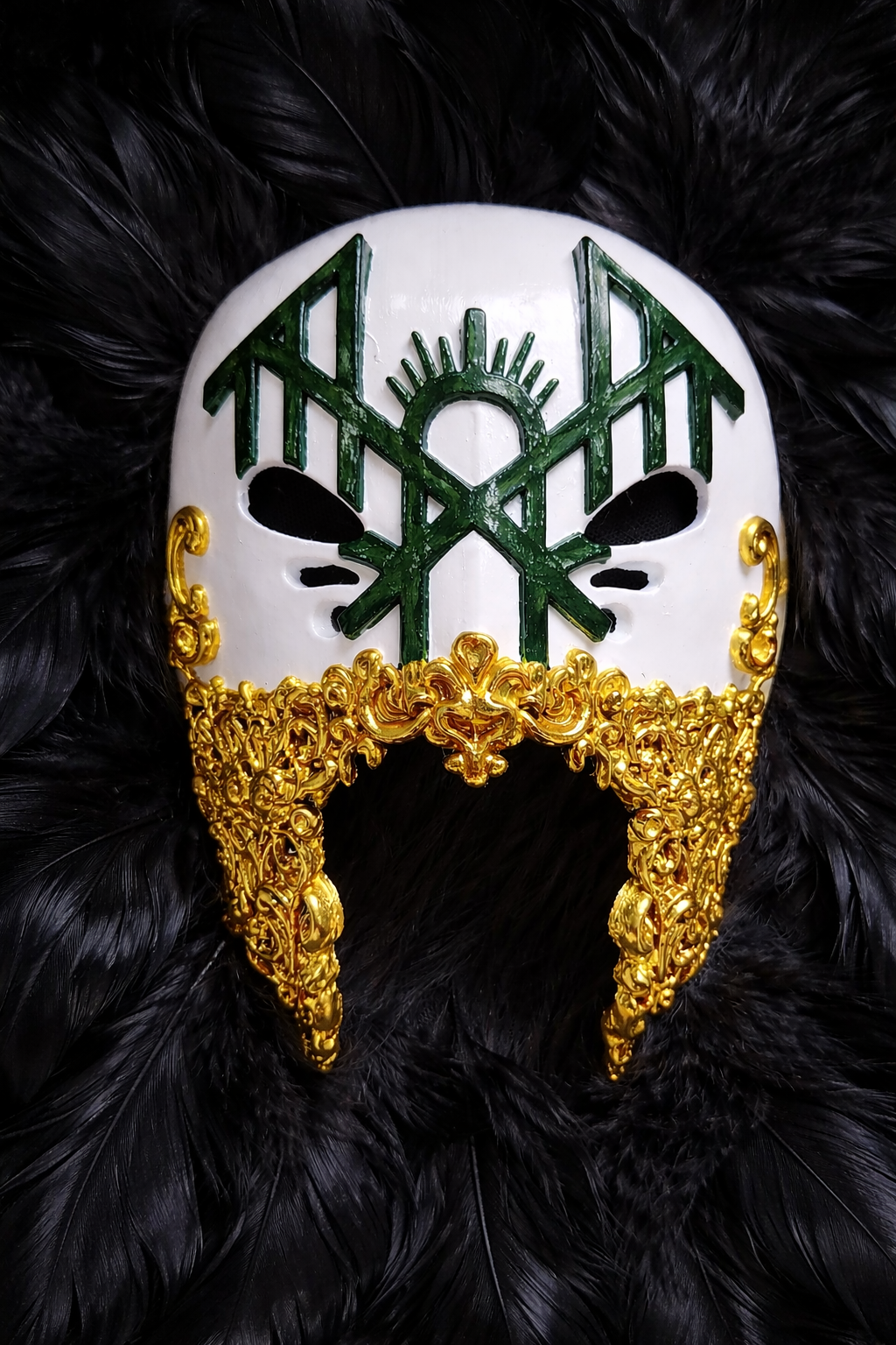 The Sleep Token Vessel Ritual Mask – Ornamented Edition captures the enigmatic and ritualistic essence of Vessel with a striking visual presence. With a white base featuring symbolic green markings and an intricate golden baroque structure, this piece blends mysticism and luxury in a bold and theatrical design.